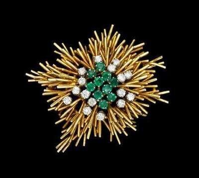 French 18 karat yellow gold, diamond and emerald spray brooch 1950s