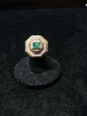 Square, step cut emerald set with thirty-two round cut diamonds in an 18 karat yellow gold octagonal setting.