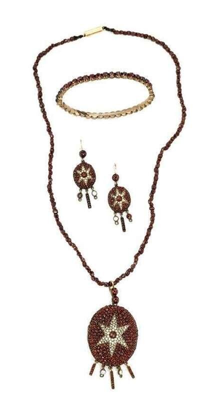 Victorian jewelry set with rose cut garnets and seed pearl accent, earrings, necklace and earrings.