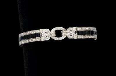 Set with 27 square cut sapphires with round cut diamonds and set into 18 karat white gold.