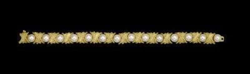 Fourteen traditional cultured pearls with pink luster, approximately 7mm each set within textured 18 karat yellow gold.