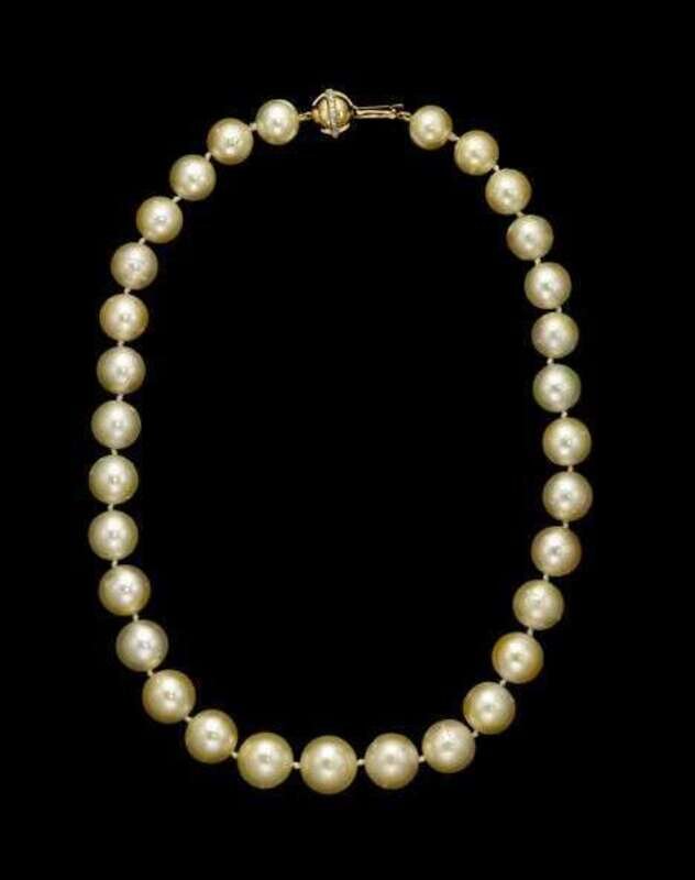 Thirty-one round 14 mm pearls, with yellow luster, diamond and 14 karat yellow gold clasp.