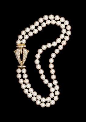 Cultured pearl necklace with large 14 karat yellow gold clasp pave set with diamonds and sapphires. Seventy-three pearls each measure 8mm, with cream color luster.