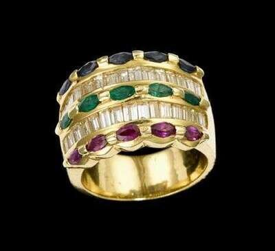 Contemporary band style ring in 18 karat yellow gold with oval cut rubies, emeralds and sapphires. Each channel is split by baguette cut diamonds.