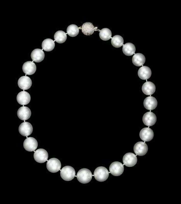 Twenty-seven 18mm white South Sea pearls with 14 karat white gold clasp pave set with single cut diamonds.