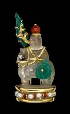 Charming Asian inspired rock crystal Buddha design set with jade, carnelian and seed pearls. Yellow gold stamped on reverse 18k with the makers mark, "Seaman Schepps".
