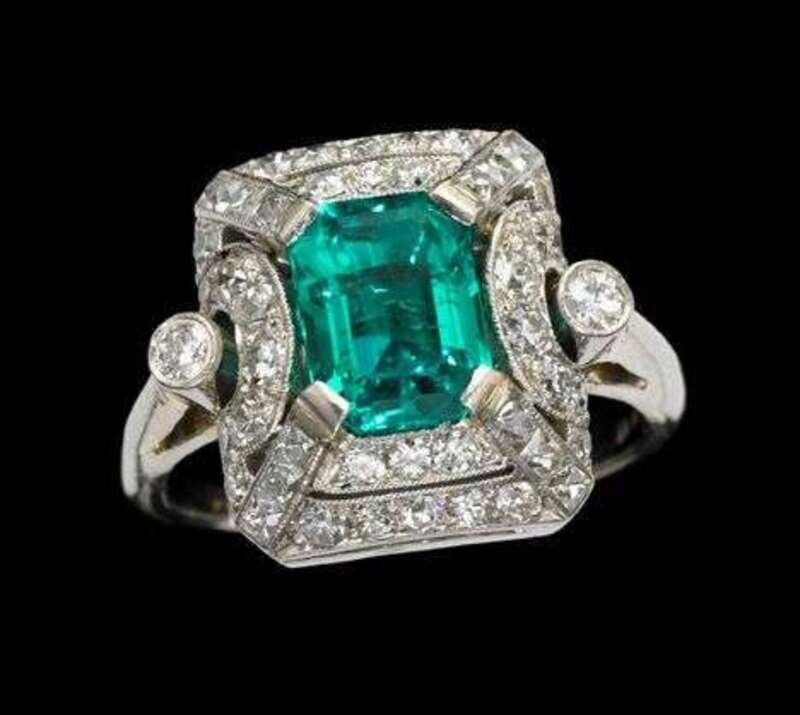 Bright, step cut emerald in a platinum Art Deco style setting with round cut diamonds sorround.