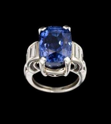 Large 18.5 carat sapphire flanked by eight baguette cut diamonds, total weight of diamonds approximately 1 carat.