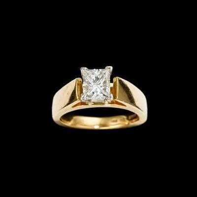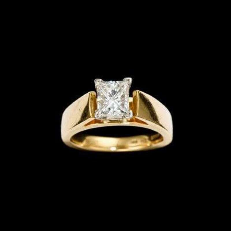 Contemporary princess cut 1.2 carat diamond with platinum prongs and 18 karat yellow gold ring band. Inside of ring stamped with GIA report number 10757772, carat weight "1.02", "Plat", "18k" and signed "HDS" "DCKAR".
