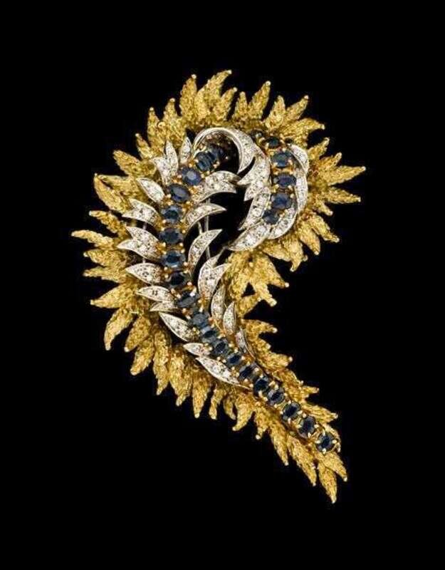 Twenty-six oval cut dark blue sapphires set into 18 karat white and yellow gold feather form accented by round cut diamonds of graduating size. This piece is accompanied by a commisioned jackets that fits around the original brooch.