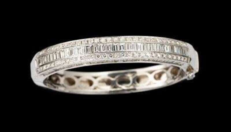 Approximately one hundred sixty-nine baguette and round cut diamonds set into 14 karat white gold. Total diamond weight, approximately 15 carats.