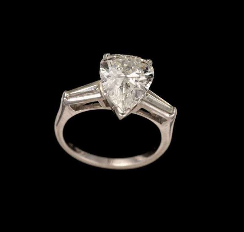 Pear shaped diamond weighing approximately 3.7 carats, flanked by two long, tapered baguette diamonds.