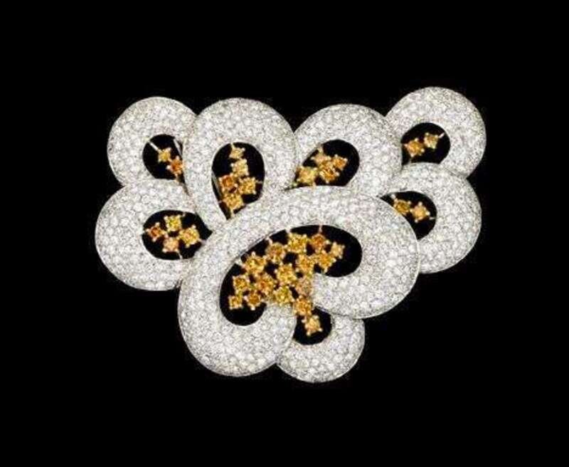 Unsual contemporary form displaying approximately four hundred twenty round cut white diamonds, thirty-six yellow diamonds of graduating size.