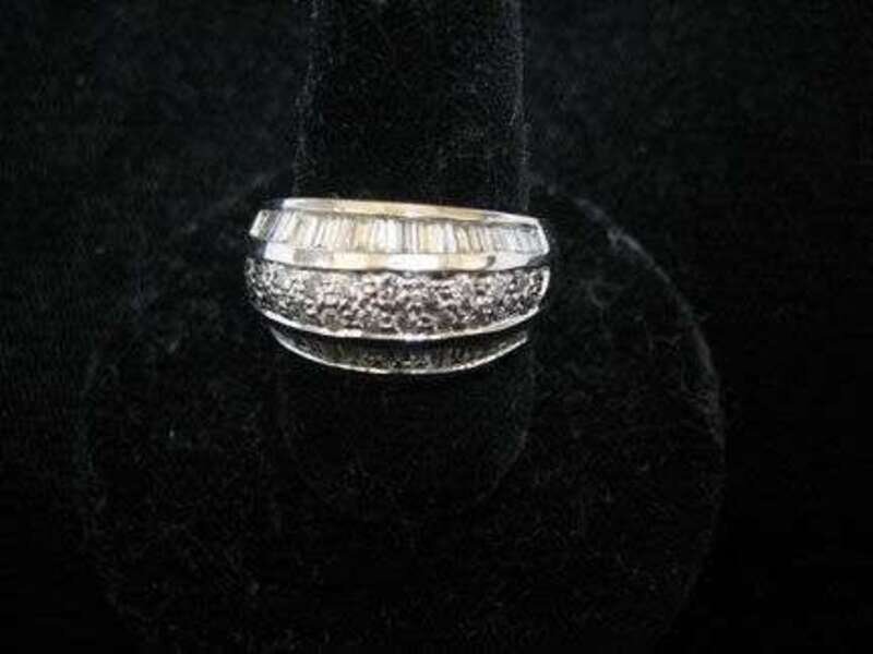Tri-channel, the middle set with twenty-eight round diamonds flanked by bands set with a total of thirty-four graduated baguette diamonds. Total weight of all diamonds about 1.75 carats.