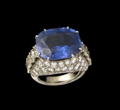 Impressive sapphire approximately 13 carats, modified cushion cut set in platinum with over 1 carat of marquise and round cut diamonds setting. French assay marks, and Cartier hallmark on ring shank.