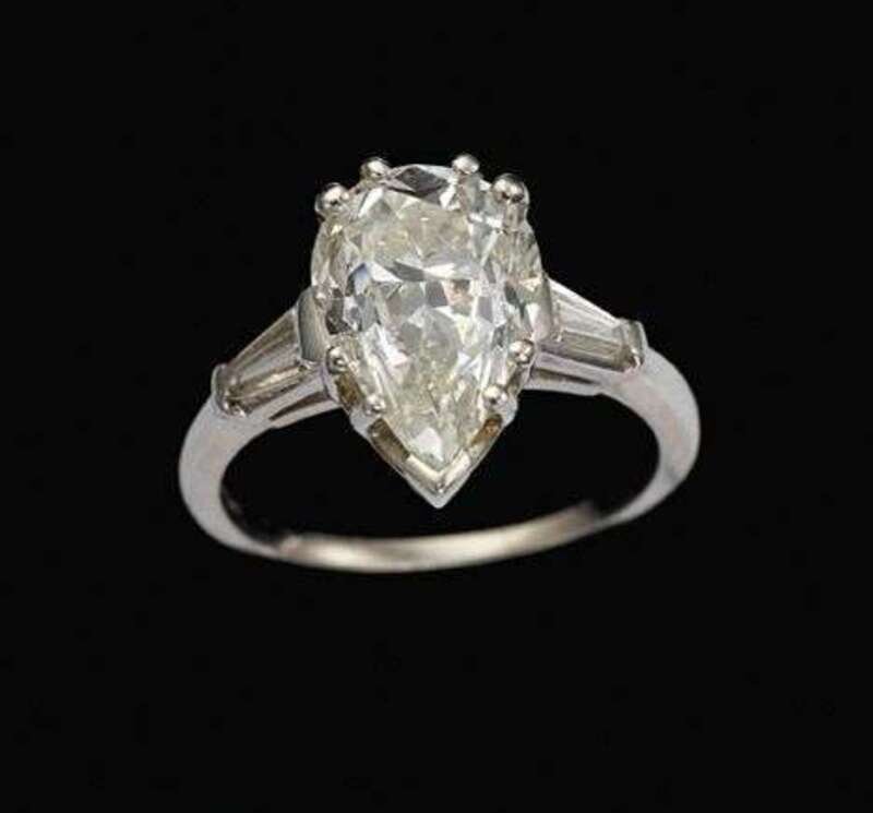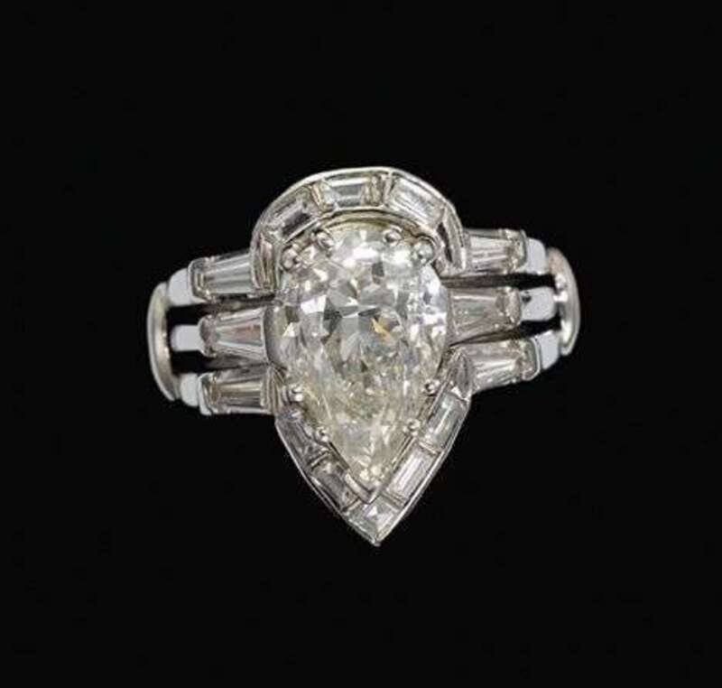 Pear shaped diamond ring framed by baguette cut diamonds, total diamond weight is approximately 6 carats set into a platinum setting.