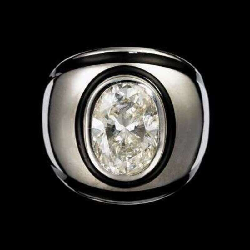 Large 8 carat oval cut diamond in 18 karat white gold bombe form setting and accented with black enameling along the edges. Signed Webb, 18k. Accompanied by the original box.