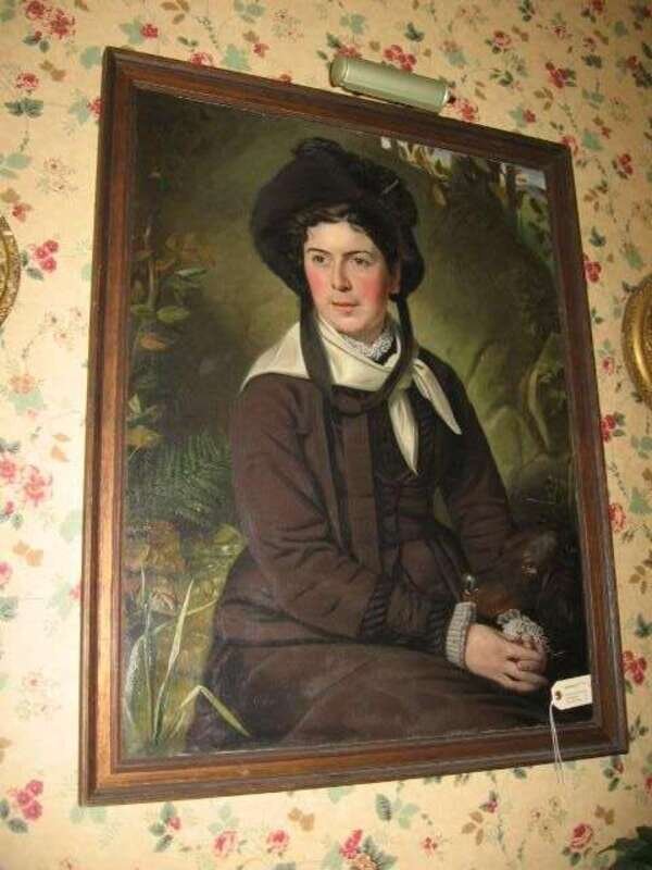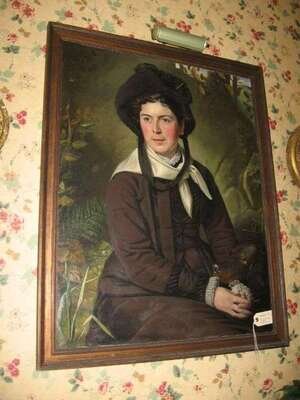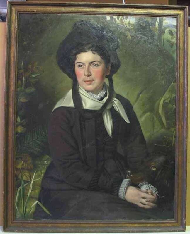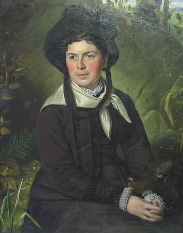 J*D* MERCIER (CONTINENTAL SCHOOL 19TH CENTURY) PORTRAIT OF A VICTORIAN LADY IN BLACK FEATHERED HAT AND HER IRISH SETTER SURROUNDED BY A NATURAL LANDSCAPE OF FLORA
