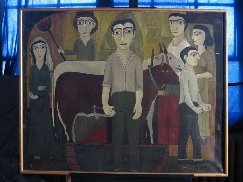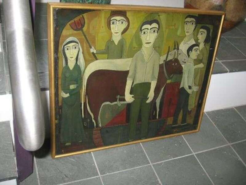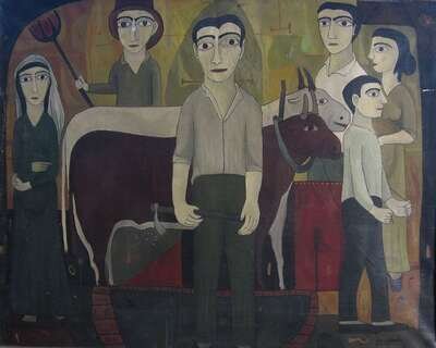 JOAN BROTAT (SPANISH 1920-1990) GROUP OF FARMERS WITH TWO BULLS
