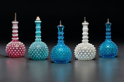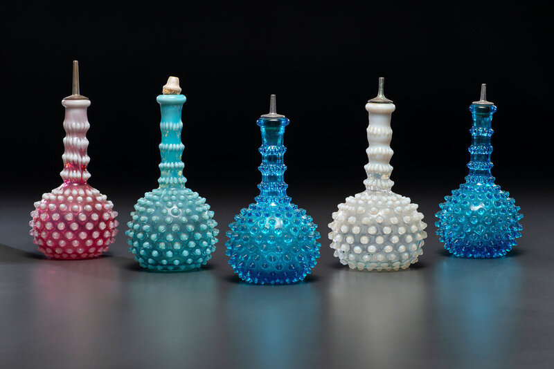 comprising cranberry, blue and white milk glass examples, and a pair of blue bottles.