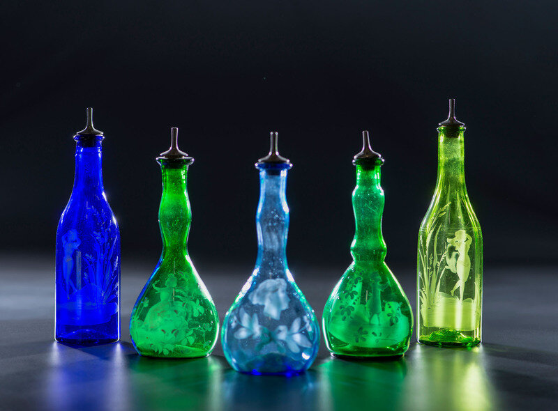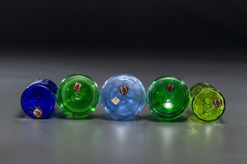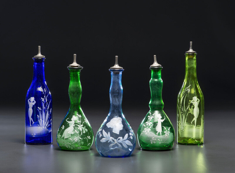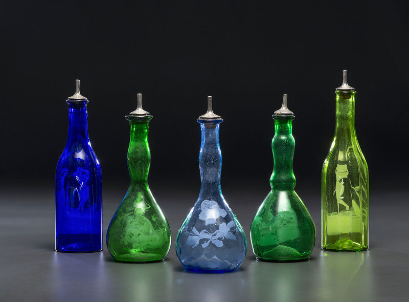 Five Green and Cobalt 'Mary Gregory' Glass Barber Bottles
