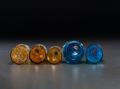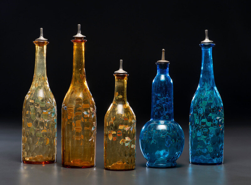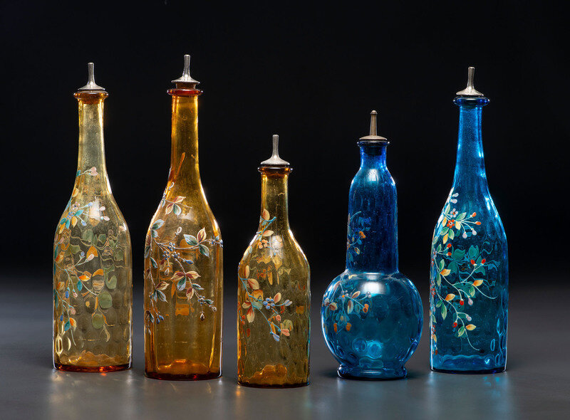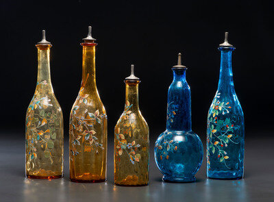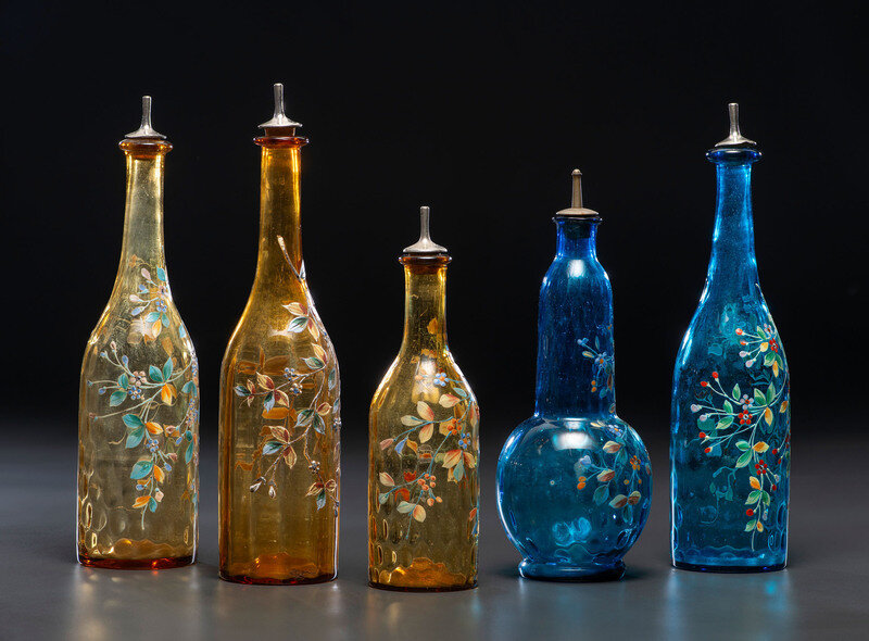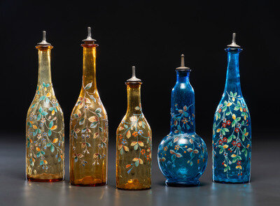 Five Paint and Enamel Decorated Glass Barber Bottles