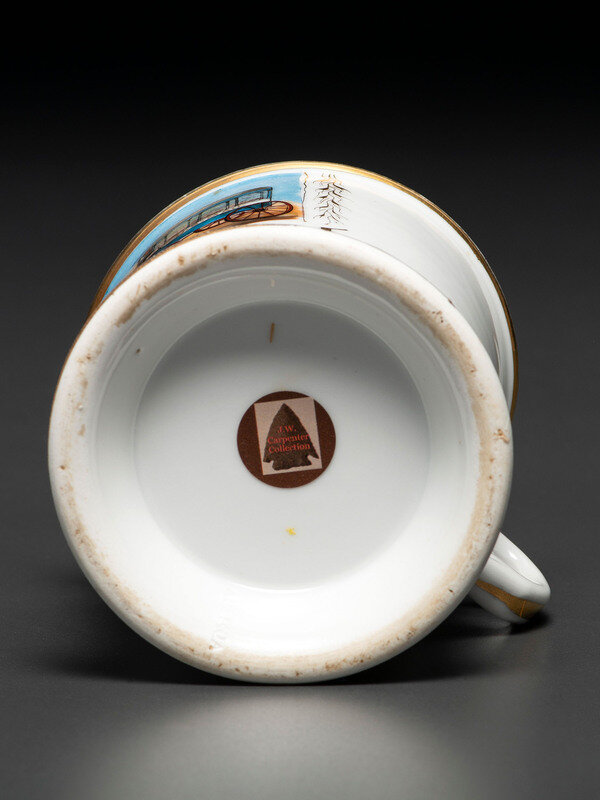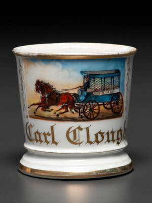 with the name Carl Clough in gilt lettering below an image of a gentleman driving a horse-drawn mail wagon that reads U.S. Mail in gilt lettering.