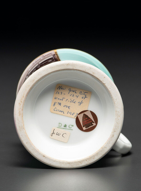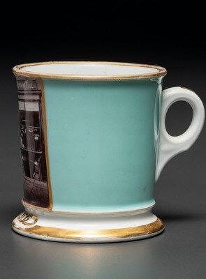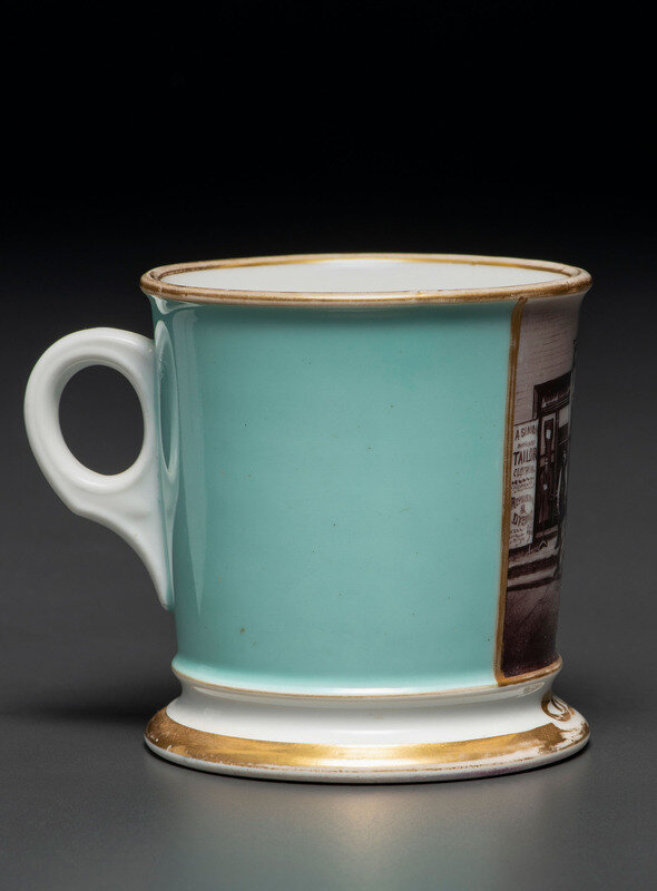 A Paint Enhanced Photographic Transfer Porcelain Occupational Shaving Mug Depicting a Tailor's Shop