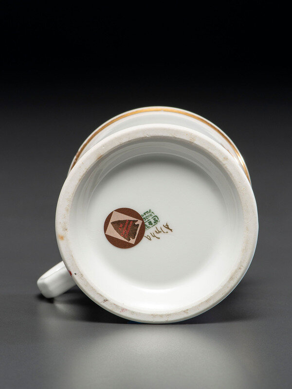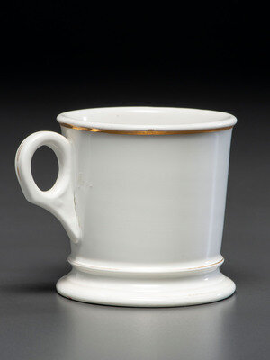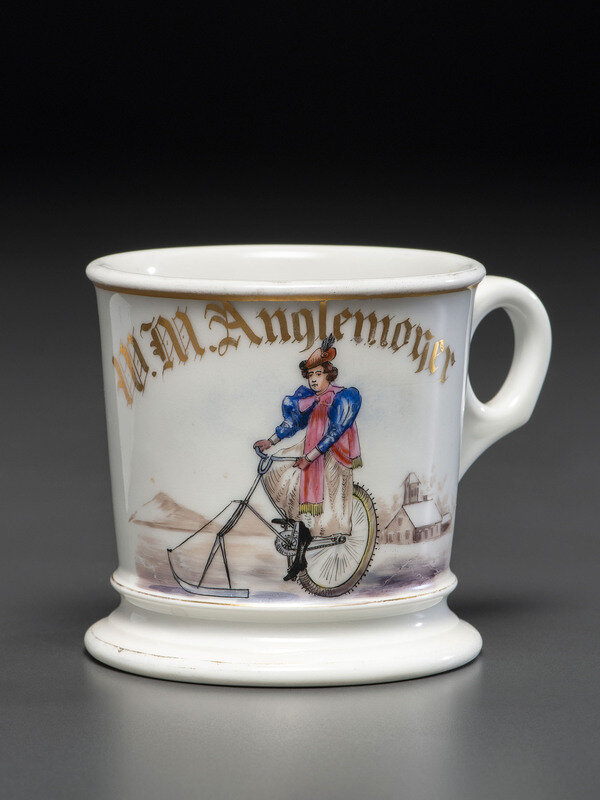 A Porcelain Shaving Mug Depicting a Woman Riding an Ice Velocipede