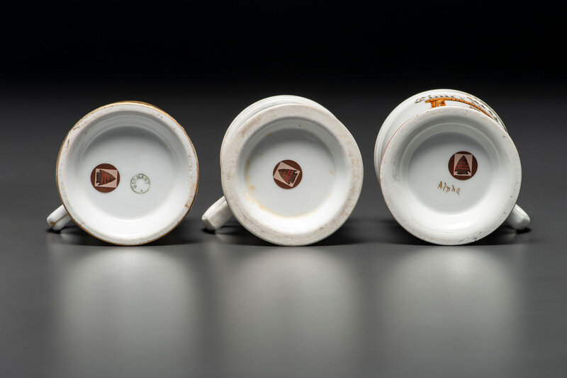 underside of mug with three owls marked Germany to underside; underside of mug with logs inscribed Alpha in gilt.