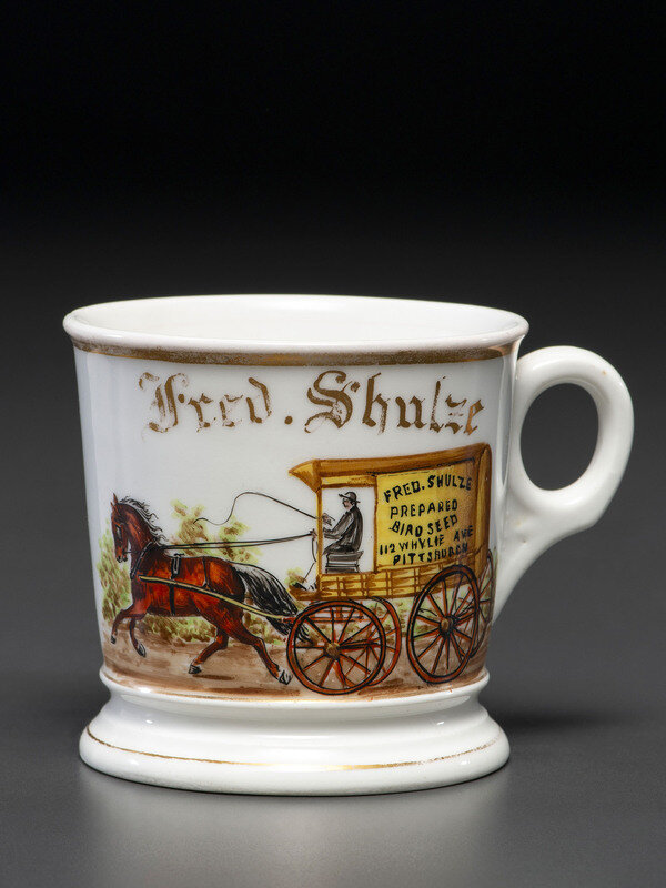 bearing the name Fred Shulze in gilt lettering, and depicting a gentleman driving a horse-drawn wagon that reads Fred Shulze / Prepared Birdseed / 112 Whylie Ave. Pittsburgh.