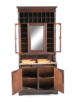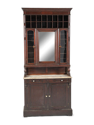 An Oak Stepback Marble Top Barbershop Cabinet