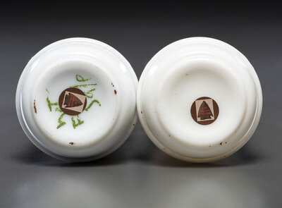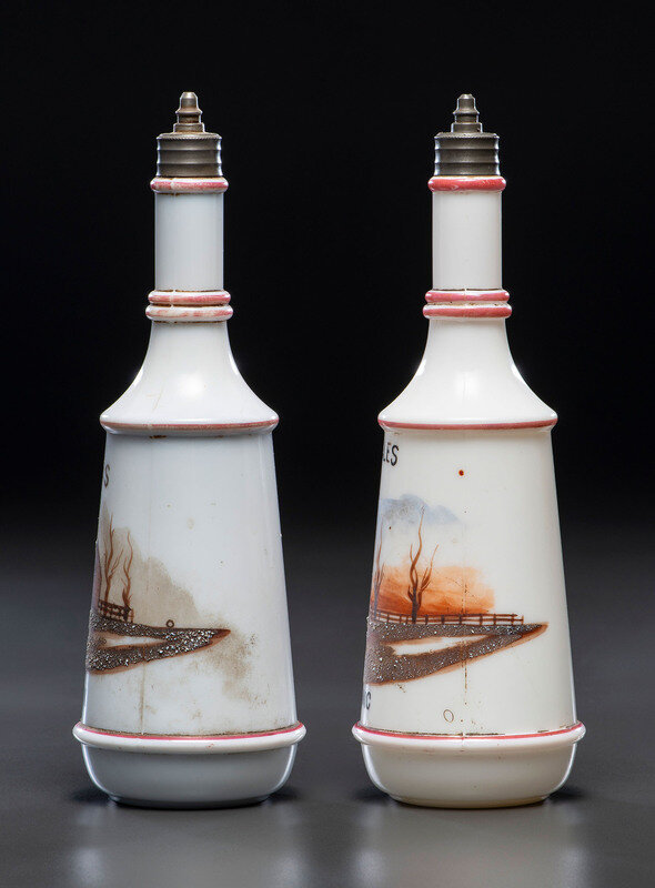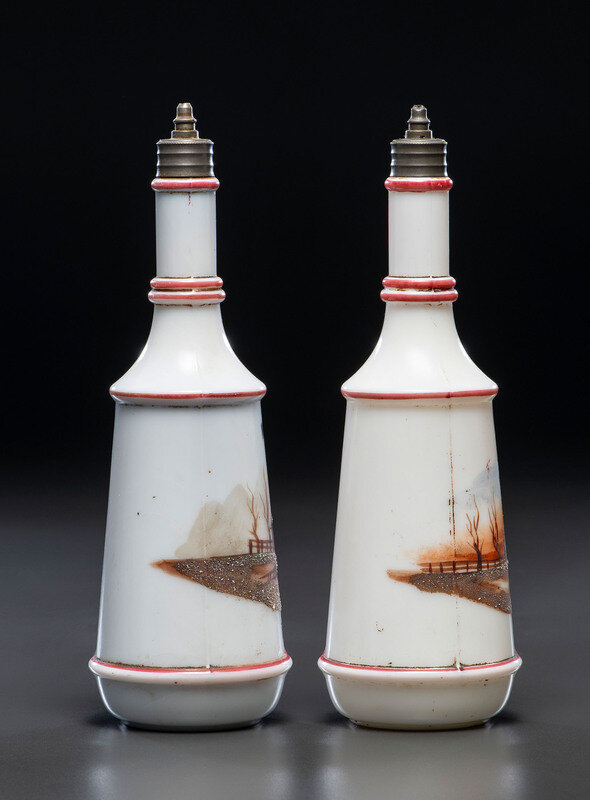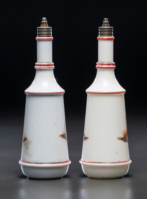 A Pair of Hand Painted Personalized Milk Glass Barber's Bottles