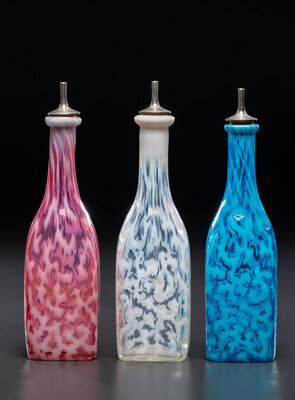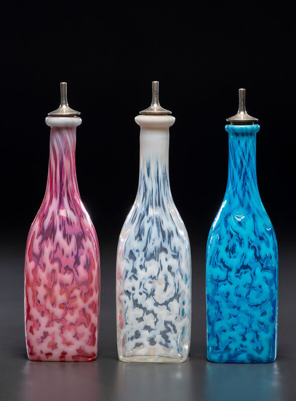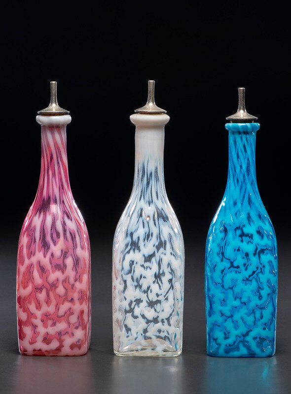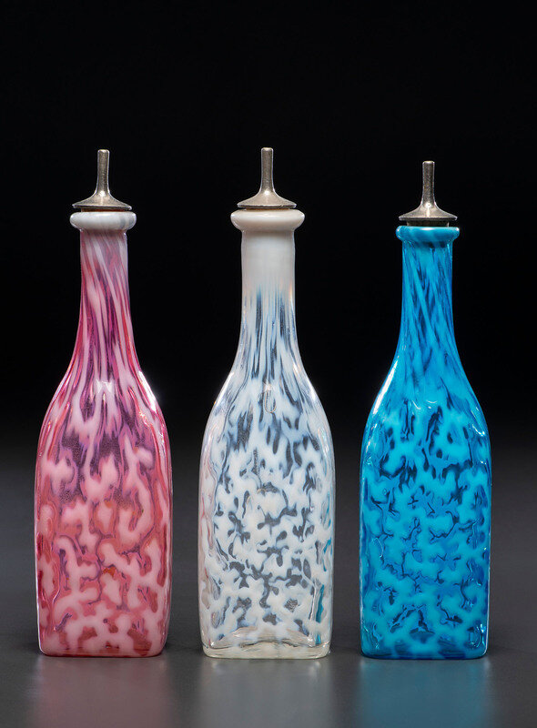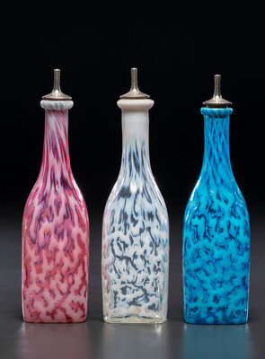 Three Coral Opalescent Glass Barber's Bottles