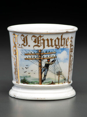 bearing the name C.J. Hughes in gilt lettering, and featuring a telephone linesman on a pole fixing wires.