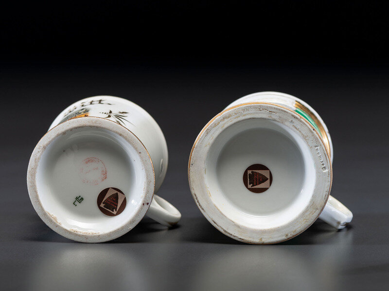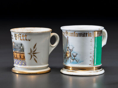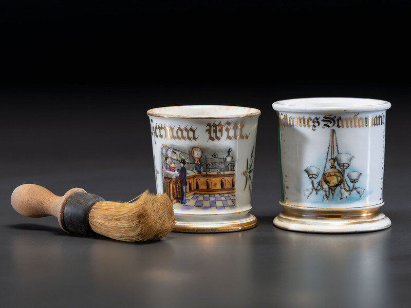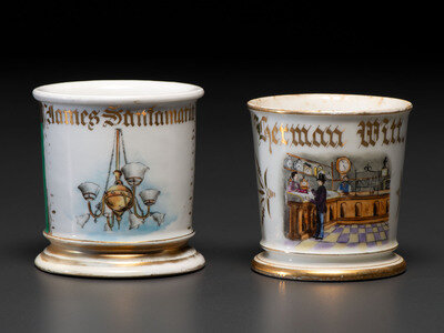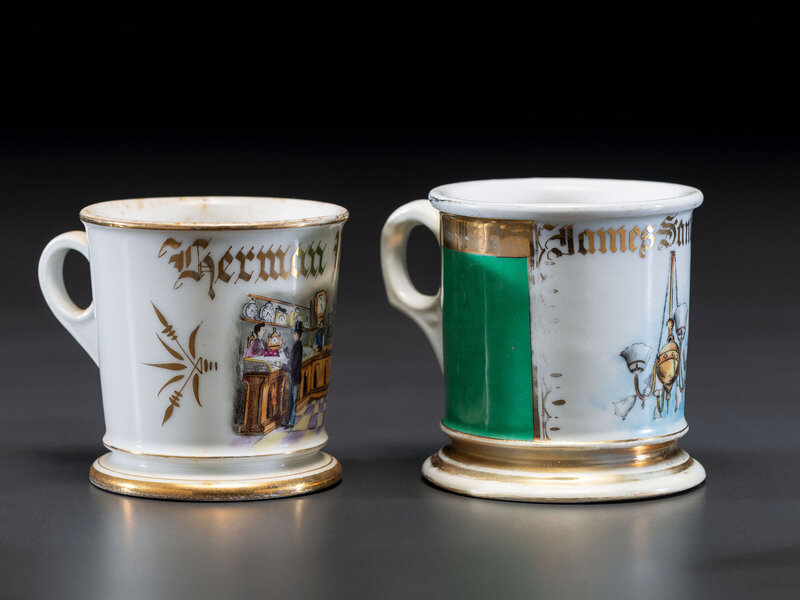 Two Retailer's Porcelain Occupational Shaving Mugs