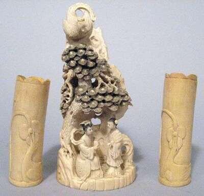 Pair of elephant Ivory brushpots and a Chinese ivory model early 20th century