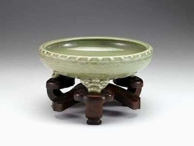 Of cylindrical form, rounded rim worked to show two stud bands enclosing a trellis-diaper over three well carved mask feet, orange fired interior worked in low relief to show foliate sprigs, orange-fired foot, over a good 18th century hardwood stand.