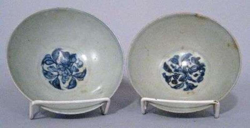 Of U-shape form the inner wall painted to show a small peony sprig, the outer wall painted the eight Buddhistic symbols within scrolling peony, enclosed by a ruyi band to the base, raised on a short foot.