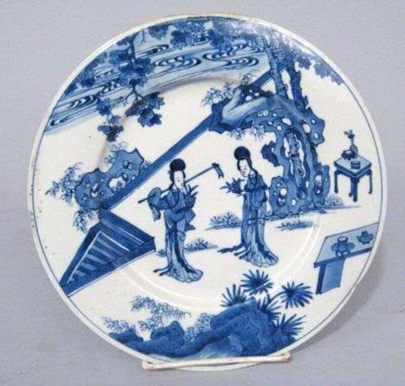 Of slightly recessed base, the surface well painted in cobalt blue to show female beauties in a rock-work garden.