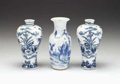 The short everted rim mouth issues from a wide shoulder tapering body painted cobalt blue to show scholars, pine trees, Fu bats and rock work.