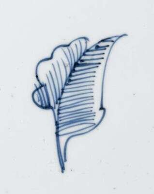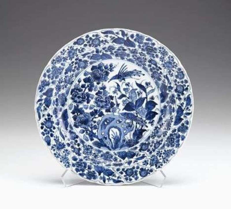 Of foliate lotus petal form, painted in rich cobalt blue to show a profusion of floral sprigs to the rim and carvetto enclosing a central medallion of peony, rock work and peacocks.