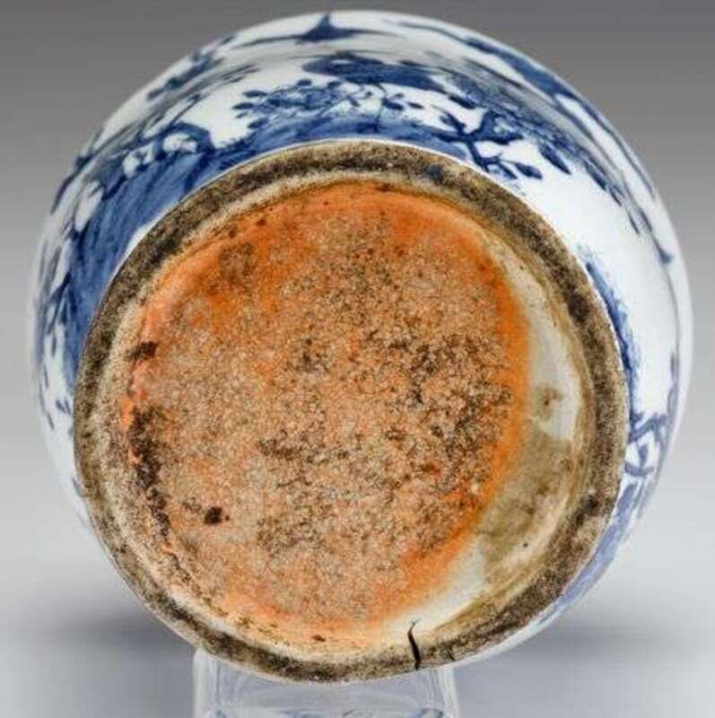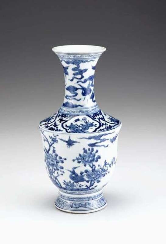 Of unusual form, wide flared mouth issues from a long waisted neck painted cobalt blue to shoe egrets amongst clouds enclosed within a diaper band, the slightly sloped shoulder shows quatrefoil medallions of foliate sprigs within scrolling leaves, above a body painted with song birds and foliate sprigs, Greek key diaper to flared base, rough unglazed base.