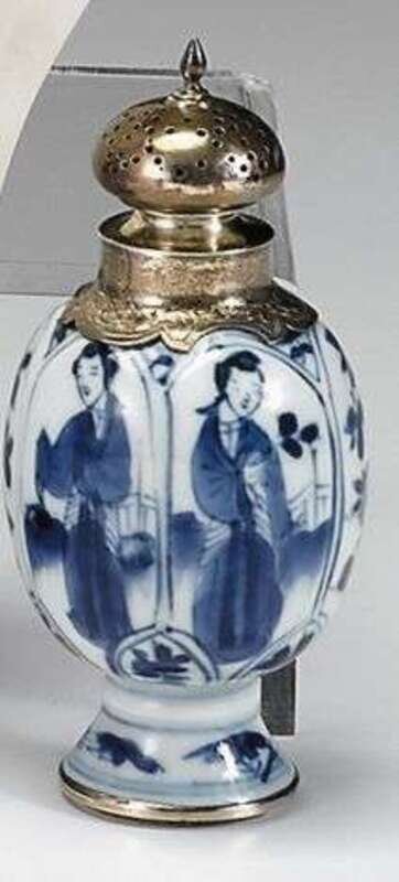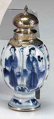 Chinese silver mounted blue underglaze castor artemisia leaf mark, kangxi period