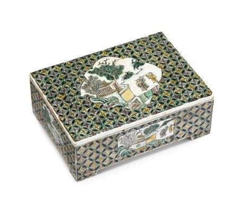 Of typical rectangular form, the cover and base enameled to show cartouches of figures among a landscape on a geometric ground of aubergine, yellow and green enamel, unglazed interior, raised on bracket feet.