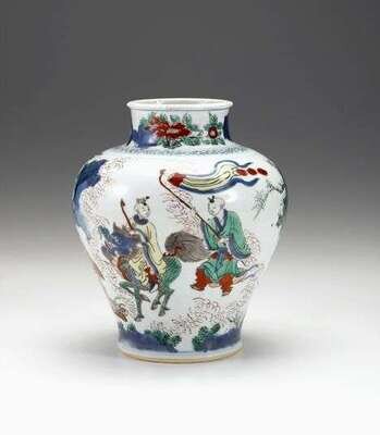 Of wide baluster form, the straight neck issues from wide shoulders tapering to a flat circular foot, decorated with blue underglaze and red, green and yellow enamel to show a figural landscape procession including a boy riding a mythical beast followed by a lantern carrier, japanese silk cover and tomobako.