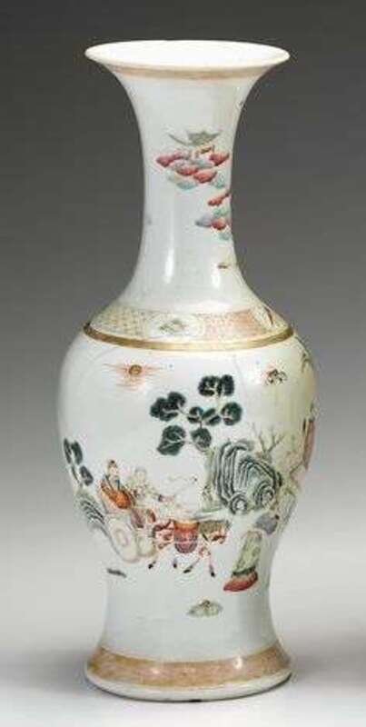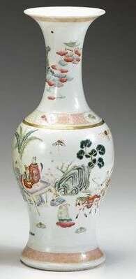 Flared rim over a wisted long slender neck painted to show rock work and pastel enameled ruyi clouds, over a pink diaper band to the shoulder broken by four oval medallions of Buddhistic symbols above a gilt band, the body painted with a horse drawn chariot, debating scholars among a garden and butterflies, the flared base terminating in a pink diaper band.