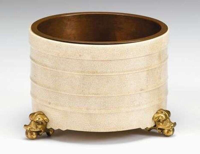 The deep cylindrical pot with cream crackle glaze and incised ribbed body is fitted with copper insert, raised on three well cast gilt-bronze feet.