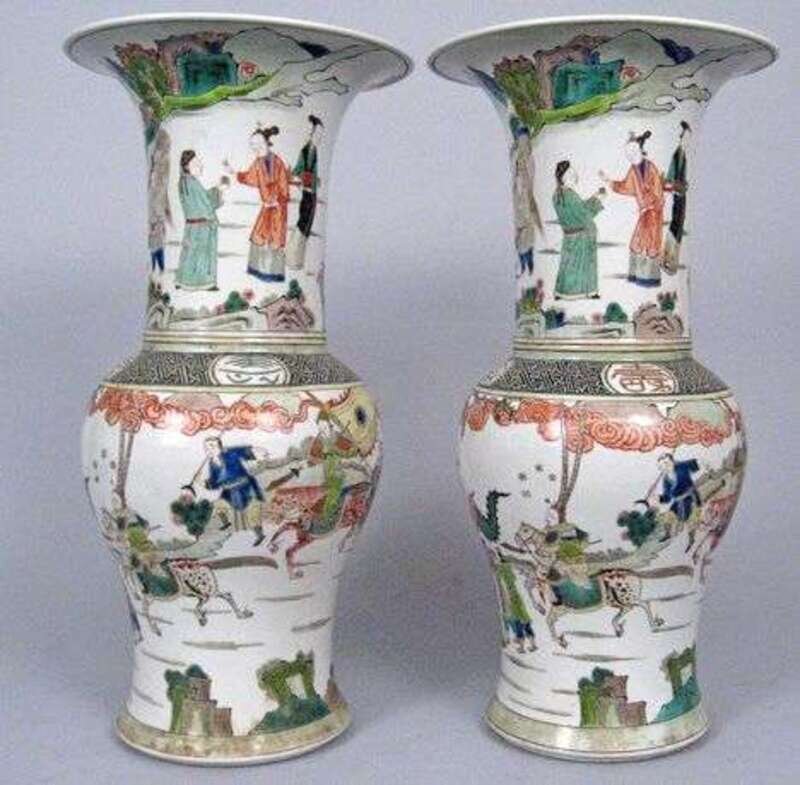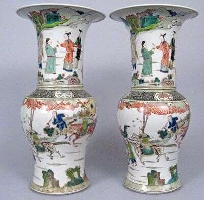 Potted with a wide flared mouth issuing from a straight neck over a baluster body terminating in a circular unglazed foot, enameled green, iron-red, blue and gilt to show court scenes and horsemen, bisected by diaper to the shoulder.