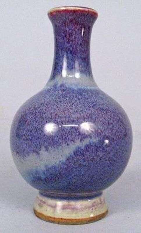 Heavily potted with a waisted neck issuing from a compressed ovoid body raised on a wide flared foot, the puple glaze thins at the rim a whitish profussion highlights the body terimating at the top of the foot, the base with a slight crackle under a white glazed.